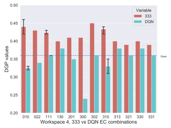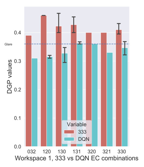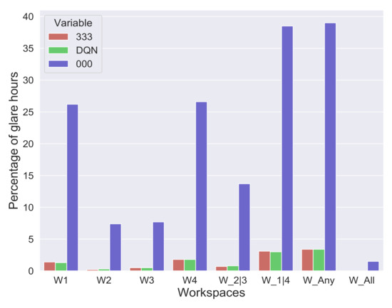 It can be observed in Figure 14 that the occurrence of glare hours by the DQN Agent’s combinations and 333 are almost the same. In some cases, combination 333 has more glare hours than the DQN agents’ combinations in workspace 1. This is a particular scenario that is not expected to happen, as combination 333 restricts more light than any other possible combination. A deeper understanding of these scenarios is required to know how the DQN agent’s chosen combinations performed better than combination 333 in avoiding glare.