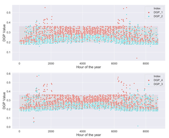 Though the DQN agent performs better than the darkest combination 333 in reducing the glare, still there are certain scenarios where it cannot completely avoid it. Figure 17 shows the DQN agent’s performance over the year from January to December (0 to 8760 h). It can be observed (DGP values above 0.36) that for all the positions the glare occurs mostly at the beginning and end of the summer, i.e., during spring and fall seasons. This can be attributed to the fact that Solar altitudes are lower in these periods. Workspaces 1 and 4 have more glare compared to 2 and 3 due to they being close proximity of EC glass and having more view towards the sky.