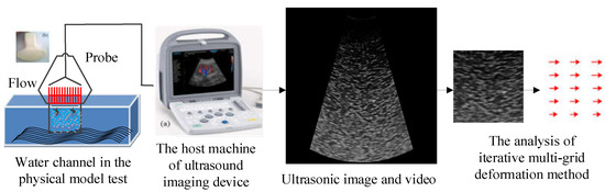 The ultrasound PIV system mainly contains an ultrasound imaging device, two probes, an interface program, and a related physical model. The two probes are convex array or linear array, which are used to connect to the host machine of the ultrasound imaging device. They are used to generate a 2D ultrasonic image by pulsing the array elements in the probe at different times [26,27]. Each array element transmits an ultrasonic pulse into the flow, and sand particles in the flow can reflect ultrasonic echoes to the array elements where they can be recorded [28]. The amplitudes of the reflected ultrasonic echoes and transmission time delays are used to create a series of ultrasonic images [29,30]. The time delays are used to determine the spatial position of the sand particles in the flow, and the amplitudes are used to assign the reflected intensity of the particles. To obtain the ultrasonic image, the needed time is determined by the convex array probe when it has finished the transmission and reflection of all array elements. The acquisition and analysis process of the ultrasonic image is shown in Figure 1. Then, these ultrasonic images are used to analyze and calculate the flow velocity vectors in silt carrying flow through the interface program.