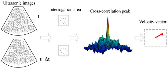 Just as with optical PIV methods, the measuring principle of the ultrasound PIV system is also based on the basic principle of cross-correlation shown in Figure 2. The number of pixels in the ultrasonic image is generally smaller than in the optical image, so the spatial resolution should be increased. As for the limitation of the ultrasound PIV system when applied to flow velocity measurement, the dynamic range of ultrasonic waves is the primary limitation. The frame rate of the formed ultrasonic image also has the limitation of image acquisition speed because of needing more time to generate high-resolution ultrasonic images for the device when compared with the optical PIV method. Therefore, higher frame rates and higher image resolution systems can be more available, and the actual application can be more accurate and welcome. In this paper, an improved measurement system that can enhance the measured accuracy of ultrasonic images is described [31] and provides a novel method based on the cross-correlation principle through discrete window offset [32]. This approach can make full use of the deformation of the interrogation window and rebuild this translation by reconsidering the rotation and shear of imaging particles. The displacement and detected offset in the ultrasonic image can be obtained and corrected using some iterative steps through the multi-grid deformation technique.