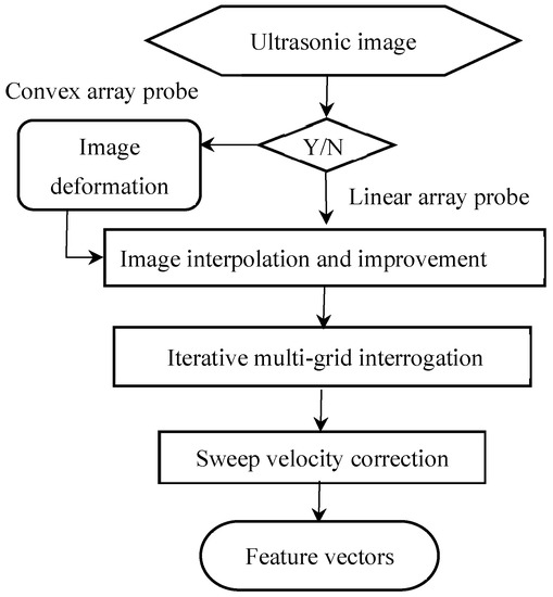 Among the steps, the image deformation should be used for an image correction when a convex array probe is used during the physical model test. This step can be skipped if a linear array probe is used because the imaging of the linear array probe is nearly rectangular without deformation. The step of image interpolation and improvement is necessary before calculating image features because the image size is relatively small. The most important step of iterative multi-grid interrogation is to realize the measurement of flow velocity by calculating the feature vector in the ultrasonic image. The basic principle of this step is based on an image cross-correlation algorithm. After the feature vector is calculated, the vector should be recorrected because it has a relationship with the sweep velocity of the ultrasound probe. Therefore, sweep velocity correction is a revised method to obtain the real flow velocity.