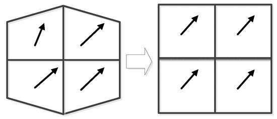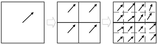 Therefore, the iterative multi-grid interrogation process can be improved by using a hierarchical approach. The sampling grid of the algorithm can be refined continually. At the same time, the size of the interrogation window can be decreased simultaneously, which can improve the capability of interrogation window sizes by using smaller particle image displacement. This process can increase the dynamic spatial range. It is especially useful for the pretreatment of ultrasonic images with both higher particle image density and a higher dynamic range in the displacements and detected offsets. The basic principle of the iterative multi-grid interrogation process can be shown in Figure 5. The line arrow presents the direction of the flow in the box. The box is divided from one to four and then to sixteen, which means that the direction of the flow becomes more precise and clearer.