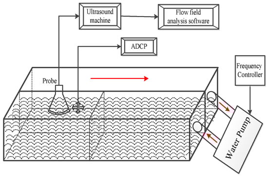 In order to verify and analyze the ultrasound PIV method and the iterative multi-grid deformation technique, we built a physical model system and carried out a series of experiments for the real-time measurement of velocity profile distribution. The schematic diagram of the ultrasound PIV measurement system is shown in Figure 6, and its physical model system for all physical model experiments is shown in Figure 7. Additionally, the measured velocities during the experiments are compared point-by-point with those of the acoustic Doppler current profilers (ADCP), and then the root mean square (RMS) error and average fluctuating velocity during the same experiments are analyzed.