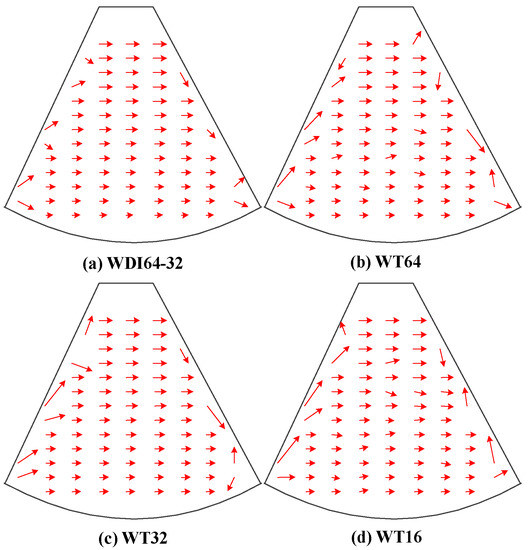 The raw vector maps obtained by different algorithms: (a) is the vector map obtained by the iterative multi-grid deformation technique with the size window interrogation from 64 × 64 to 32 × 32, referred to as WDI64-32; (b) is the vector map obtained by cross-correlation with the size of window templates 64 × 64, referred to as WT64; (c) is the vector map obtained by cross-correlation with the size of window templates 32 × 32, referred to as WT32; (d) is the vector map obtained by cross-correlation with the size of window templates 16 × 16, referred to as WT16.