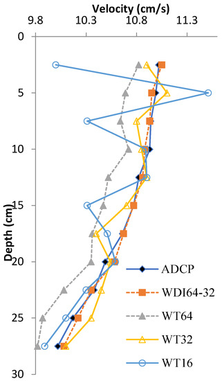 The statistical averages that are the depth-averaged velocities of profile flow field may be affected by the roughness of the coarse bed, and the depth-averaged profiles are valid over the entire flow depth [38]. The velocity profile obtained by the ADCP is taken to be the standard velocities at the same position, which has been verified. From Table 2 and Figure 10, we concluded that the velocity profile obtained by the WT64 is smaller than the actual velocity (ADCP). The velocity profile obtained by the WDI64-32 is similar to actual velocity. The stability of the velocity profile obtained by the WT16 is poor. In contrast, the velocity profile obtained by the WT16 has the worst among them.