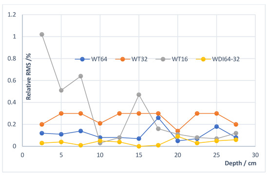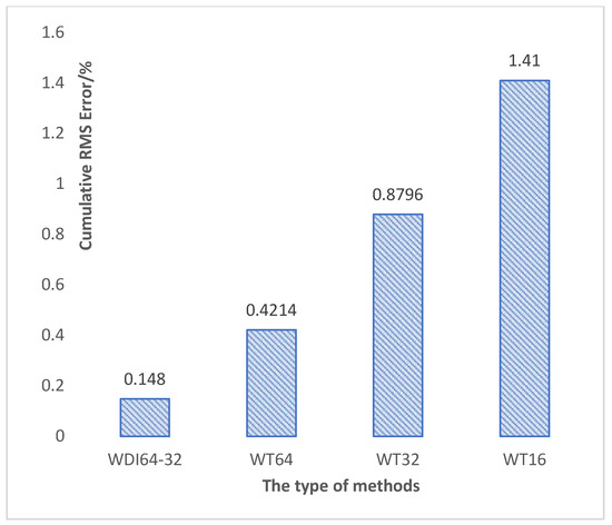 Cumulative RMS error of the WDI64-32, WT64, WT32 and WT16 methods.