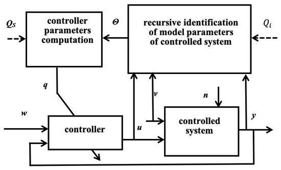 The main reason for using adaptive control is that the systems change over time or the characteristics of the controlled system are unknown. The basic principle of adaptive systems is to change the characteristics of the controller based on the characteristics of the controlled process [21]. The general scheme of the self-tuning controller is shown in Figure 3.