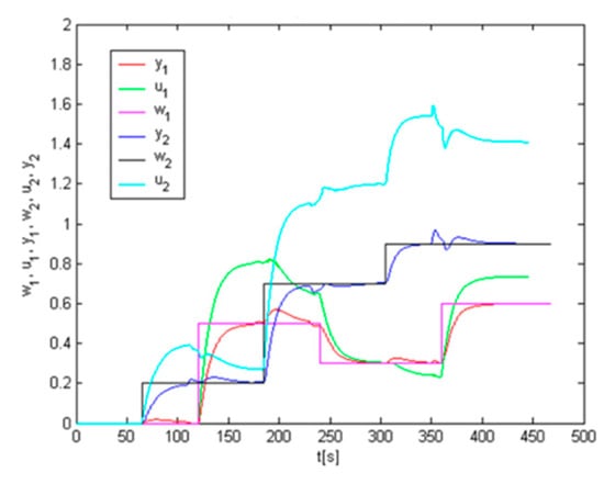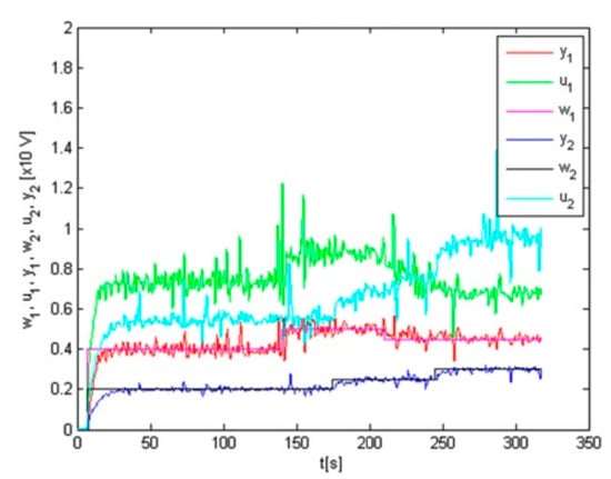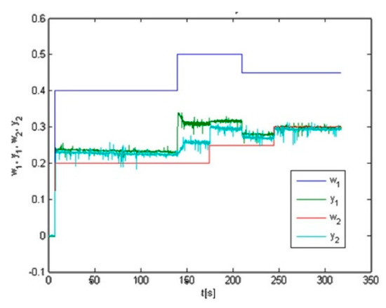 We used our algorithm, pre-identification, at this system and we obtained the following results, see Figure 10, Figure 11, Figure 12 and Figure 13. First, we performed system response on the given set-points depicted in Figure 10. Together with this system response, we obtained the system pre-identified parameters shown in Figure 11, for the first subsystem in the left one and for the second subsystem in the right one. According to these pre-identified parameters we performed the simulation of control which is shown in Figure 12. During the control, the controller parameters were changing, and they are recorded in Figure 13, for the first controller in left one and and for the second controller in the right one.