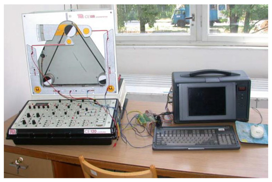 We verified the presented method in real-time control using MATLAB at CE108 Coupled Drives Apparatus Model [26] which is shown in the Figure 9. The laboratory model CE108 allows solving practical problems of tensioning and speed of material movement in continuous processes. An example is the speed and tension of the thread when rewinding from one spool to another, which must be controlled. This situation is adapted for laboratory measurements so that the elastic band is mounted on three wheels. The lower two wheels are fixed, their speed can be measured and regulated. The third wheel can move (located on a movable arm suspended on a spring) and simulates a workstation along with tension and speed measurements. Two servomotors control the speed of movement and tensioning of the belt. The speed is 0–3000 rpm, which corresponds to a voltage of 0–10 V. Tension measurement is indirect through the angle of the movable arm, from −10 ° to 10 °, which corresponds to a voltage from −10 V to 10 V. Inputs and outputs are located on the front panel of the device; it is the control voltage to the servomotor amplifiers, which are bidirectional, and which are inputs. There are four outputs, the voltage corresponding to the speed of the two servomotors and the voltage corresponding to the tension and the speed of the belt.