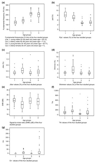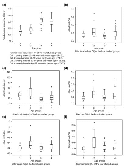 Previous studies [,] have found that the fundamental frequency (F0) can be affected by different factors, such as age, vocal fold length, and language or ethnological background. It was also observed that the most commonly used acoustic parameters depend on F0. Aging has been known to influence the classification performance results of acoustic parameters. Natalie et al. conducted a study to provide preliminary acoustic standards for the voices of elderly (60–80 years old) and young populations (20–30 years old). In older individuals, they found direct relationships between the tone of voice and the degradation of acoustic parameters, such as jitter and shimmer [,,,,,,,,,,,,].