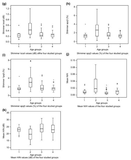 The mean N/H in Figure 1j shows the amount of noise associated with the harmonics of the waveform: the higher the value, the lower the overall sound quality level. The results show that the parameter values were much higher in older people of both sexes (women and men over the age of 60). Noise is caused by changes in frequency and amplitude (jitter and shimmer), subharmonic components, and instantaneous voice interruption; thus, the reliability of the above results is supported. The mean N/H in Figure 1j also confirms that voice aging leads to a general deterioration of speech quality that can be objectively measured. The mean H/N dB shown in Figure 1k defines the relationship between the intensity of harmonic and nonharmonic components in the overall spectrum of the measured voice signal. The greater the value, the clearer the speech quality. In this study, older male subjects scored much lower than younger males, indicating that the vocal performance was worse for men than women over the age of 60. The reduction in harmonic components can be explained by changes in the resonant structure of the vocal tract.