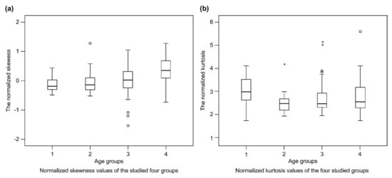 The statistical analysis between young and elderly voice signals in Table 3 was performed using Mann–Whitney’s U-tests for non-Gaussian distributions and two-sample t-tests for independent samples. The significance level was set to p < 0.05. Young and elderly voice signals significantly differed in normalized skewness in women (p = 0.005) and normalized kurtosis in men (p = 0.011). Thus, they can be viewed as age-related parameters that differ according to gender. Since the mean of normalized skewness estimated in young female voices is close to zero, the data are normally distributed. However, the values extracted from elderly male and female voices range from −0.5 to 0.5, so the data are fairly symmetrical. As the means of the normalized kurtosis are all less than 3, the dataset is considered to have a light-tailed distribution.