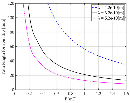 One realizes, only = B is important, not the orientation of with respect to , i.e., is independent of the angle between and . The factor is constant = 10 [T m], so a spin rotation around 180 (spin-flip) for a neutron wavelength and B = 1 mT would occur for a path length ∼21.2 mm. From Equation (6), is a function of magnetic field, path length s and wavelength . The total differential of , is