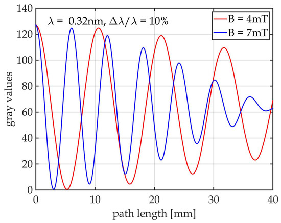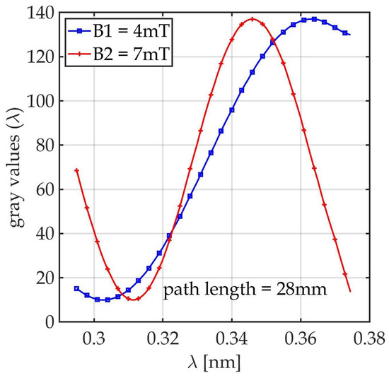 Two magnetic fields (4 mT and 7 mT) show nearly the same gray value for = 0.32 nm and a path length = 28 mm, a small change of = 0.34 nm increases the difference from 5 to 32 gray values, i.e., if the B-field in a sample is unknown, changing the wavelength may help identify B.