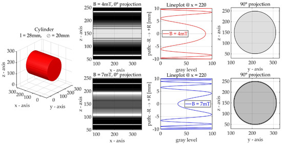 Calculated polarized neutron images: magnetized coil (red) with B-fields = 4 mT and 7 mT, four image projections due to polarized neutron imaging ( = 0.32 × 10 m) for sample orientations 0 (2) and 90 (2) with respect to neutron flight direction = y-axis, and the corresponding line plots illustrating the effect of position-dependent . Please note that the B-field is homogeneously distributed in the coil and therefore produces a homogeneous image at the 90 projections. The 4 mT B-field produces 5.3 spin flips, the 7 mT B-field 9.2 spin flips, so the gray values for the 90 orientations are very similar, gray scale = 0–127.