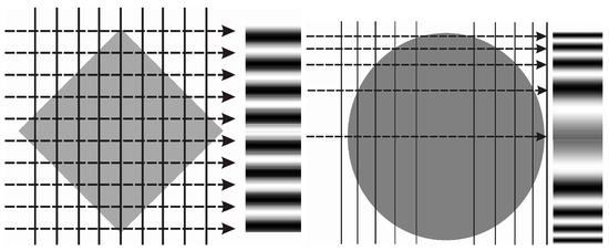 To acquire information about the lateral resolution one must use a different method. The lateral spatial resolution relates to the spatial symmetry mentioned above (Section 2.2). The divergence of B is zero, = 0, so B is constant in any volume element V = , ( in Equation (7)), one can further assume that the spatial resolution is , i.e., if the horizontal and vertical divergence () are equal, otherwise, because the vertical divergence is . The lateral spatial resolution is directly measured from moving a defined fringe pattern across the detector array, i.e., one measures the convolution of the pattern with the detector array. If is the fringe pattern function and the detector function, and one moves the pattern across the detector D, one measures the ,