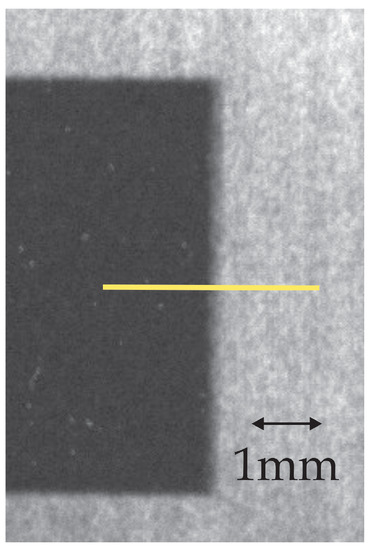 The following experiments were performed at PONTO II, an instrument of the University of Applied Sciences, Beuth Hochschule Berlin, dedicated to polarized neutron imaging at the BER II reactor of the Helmholtz-Zentrum für Materialien und Energie. The first experiments with edge measurements were performed to determine the MTF of the system and thus the spatial resolution for unpolarized neutron imaging. A Cd edge (Figure 8) was placed in a cold neutron beam ( 0.32 nm) and an image taken at a distance of 60 mm from the 2D detector, which had a pixel size = 13.5 μm (Figure 8). From the fitted shape of the smeared grid e.g., by a Gauß function, the Fourier Transform of the Gauß function, G}, yields the modulation transfer function MTF, the frequency-dependent contrast function C(f) of the edge image.