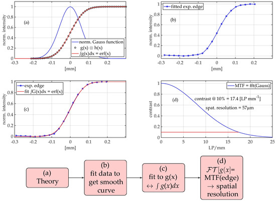 Figure 9 shows steps (a)–(d) to obtain the MTF of the edge image and thus the spatial resolution of the instrument (see also Section 2.1). First the theory (a) is fitted to the experimental edge data (b), then this fit is adjusted to the error function by varying the FWHM of the Gauß function (c). This works better than using the error function itself, and above this, the Gauß function is fitted at the same time. The Fourier transform of the (fitted) Gauß function is then used to calculate the MTF = ((G(x)) of the edge profile and to determine the 10% contrast f and thus the spatial resolution of the instrument. The correct scanning frequency is given by . The detector pixel size was 13.5 m but due to binning = 27 μm. The best spatial resolution is found at 54 μm (∼), which agrees perfectly with 2 × 27 μm () for = 5 mm. The spatial resolution also depends on the distance of the object to the detector (see Figure 1). The larger the worse is the spatial resolution. This was measured for = 5, 60, 100, 120, 140 and 200 [mm]. If one plots the particular spatial resolution as a function of one obtains the principal limit of the imaging system of ∼13 μm for , i.e., the pixel size of the detector 13.5 μm, which agrees perfectly with the data fit line for = 0 mm (see Figure 10). Comparing the results in Figure 10 one sees the discrepancy between theory based on the 1/r law if a pin hole source is used and measured data. The measured data show an entirely different behavior. The explanation is given in [41], there already could be measured that using a mosaic crystal as monochromator the pin hole as source diameter must be replaced by the mosaic structure of the monochromator yielding an improvement of the L/D ratio of a factor ∼2.7, here a factor 2.2 (Figure 10).