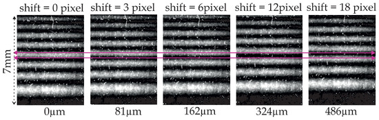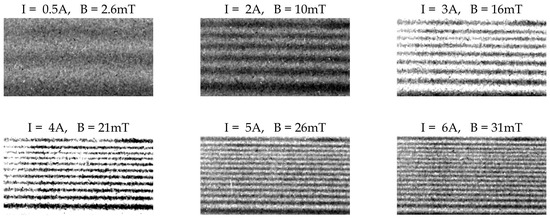 Five fringe pattern produced with of quadratic coil (from Figure 11, I = 3.5A) shifted by 3…18 pixel, pattern and fringes rotated by 90, length of the coil = 150 mm, inner Al block = , outer diameter = 35 mm, wire = Cu, ⊘ = 0.90(1) mm, resistance = 1.2 , 614 windings.