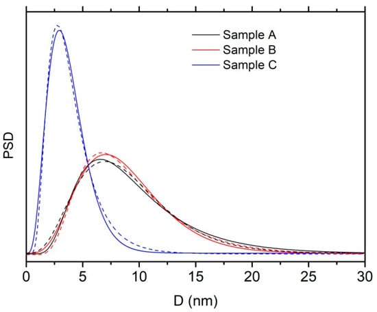 The quality of the fit is rather good with only some residual discrepancies in the region of low magnetic field. The results of the analysis, summarized in Table 5, show that the sizes of the magnetic domains are very close to the sizes of the coherence domains as determined by XRD (see Table 2), that is the crystalline and magnetic order have the same extension. The distribution curves of the magnetic domains for the three samples are shown in Figure S6, Supplementary Materials. The curves for samples A and B are broader than that of sample C. However, the relative standard deviations are the same for all the samples (see Table 5).