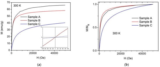 Magnetization (emu/g) vs. magnetic field intensity (Oe) curves of samples A, B and C measured at RT. The inset in the low right part of the figure shows that the NPs do not have a remanence at 300 K (a); Curves of the magnetization vs. magnetic field intensity normalized to their respective maxima of samples A, B and C measured at RT (b).