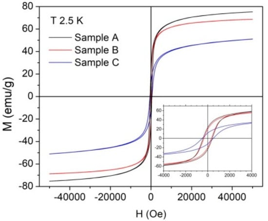 Magnetization vs. magnetic field intensity curves of samples A, B and C measured at 2.5 K. In the inset an enlarged region around the zero of the magnetic field intensity is shown.