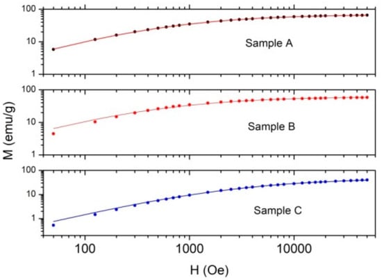 where D is the diameter of the particles, L(H,D) is the Langevin function which depends on the magnetic dipole moment (and thus on D) and on the magnetic field intensity and Pv(D) is the volume-weighted diameter distribution function [27,29,43,44]. Equation (1) was used to fit the experimental magnetization vs. magnetic field intensity curves to derive the average size of the magnetic domains and the standard deviation of the size distribution (see the Supplementary Materials). The lognormal distribution function was used for Pv(D) [27,44]. The experimental magnetization curves and their best fit curves are shown in Figure 7 for all the three samples. For a better comparison the curves are shown on a double log scale.