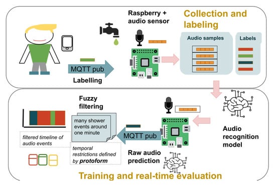 The aim of integrating audio sensors into smart boards for the recognition of daily events was to (i) collect sound samples for training purposes, (ii) train deep learning models from labelled sound samples, and (iii) recognise audio events to evaluate the trained models in a real-time context. The programming language used to code the application embedded into the Raspberry Pi was Python [47], and the deep learning models were implemented on Python with Keras, an open source library for neural networks [48]. The remote services for labelling of data and spreading the recognised output of audio events in real time were developed under MQTT, which provided a publish/subscribe protocol for wireless sensor networks [49]. This approach was inspired by the paradigms of fog and edge computing [50].
