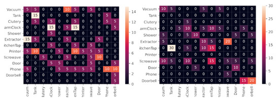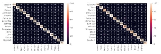 Confusion matrices in ad hoc ambient audio dataset. (Left) CNN + MFCC; (Right) CNN + LM.