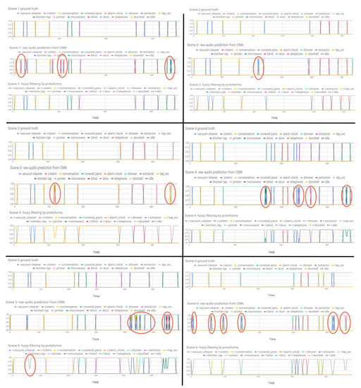 Timeline of the six scenes of the case study: (Up) ground truth of the scene; (Middle) raw audio recognition from spectral and CNN models; (Bottom) fuzzy filtering of audio recognition with protoforms. In red circles are the isolated false positives or false negatives which describe incoherent event recognition.