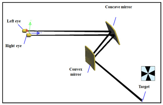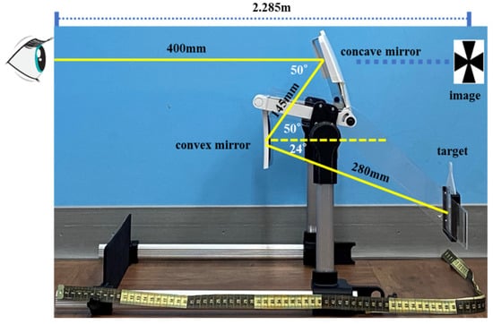 The diopters of the two mirrors were +2.83 D and −2.83 D, respectively. The distance between the human eye and the concave mirror was 400 mm; the distance between the concave mirror and the convex mirror was 145 mm; and the distance between the convex mirror and the object was 280 mm.