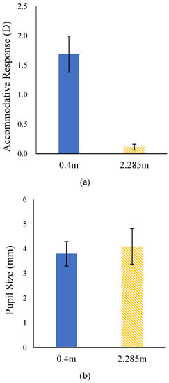 Comparison of (a) accommodative response and (b) pupil size at the two viewing distances of 0.4 m and 2.285 m.