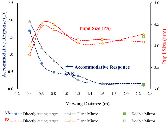 To understand the effect of the double mirror system on the accommodative response, we compared the accommodative response of directly looking at the real object, looking at the virtual image through a single plane mirror at various viewing distances from 0.4 m to 2.285 m, and looking at the virtual image at 2.285 m through the double-mirror system, as shown in Table 2 and Figure 5. Since the viewing distance of the double-mirror system is fixed, there is only one accommodative response at 2.285 m. The accommodative response varies with the viewing distance in these three ways and is presented in Table 2. When the subjects were looking directly at the real object and looking at the image through a single plane mirror, the accommodative response decreased with the increase of the viewing distance from 0.4 m to 1.6 m. When the viewing distance reached 2.285 m, the accommodative response of the above two observation methods was very close to the accommodative response obtained by the double mirror system, which was about 0.11 ± 0.05 D. The pupil size increased significantly with a viewing distance from 0.4 m to 0.6 m. When the viewing distance reached 1.2 m, the pupil size decreased significantly. When the viewing distance reached 2.285 m, the above two observation methods were very close to the pupil size obtained using the double mirror system, which was about 4.19 ± 0.07 mm. The results indicate that the accommodative response and pupil size are consistent throughout these three methods at a viewing distance of 2.285 m. The advantage of this optical design is that the object can be seen at a longer distance, and the enlarged image is easier to observe. Compared to single plane mirror imaging, the image is in the opposite orientation, from left to the right, and the double-mirror system has no such problem.