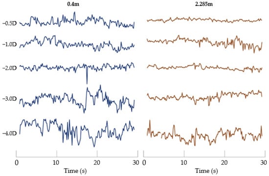 The fluctuations of the accommodation response for 5 subjects gazing at a real object at 0.4 m and gazing at a virtual image at 2.285 m for 30 s. The corresponding refractive corrections are −0.5, −1, −2, −3, and −4 D, respectively.