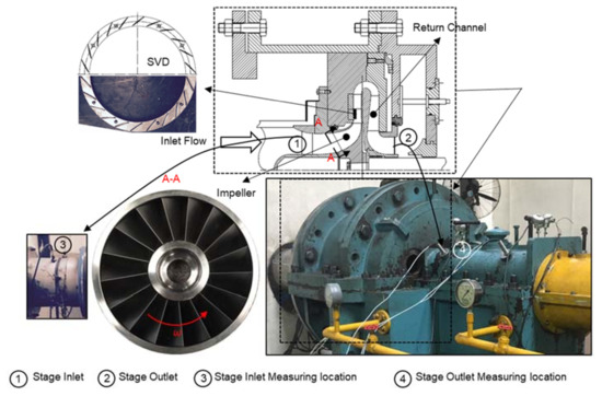 - Xue, X.; Wang, T.; Shao, Y.; Yang, B.; Gu, C. Experimental and Numerical Analysis of Unsteady Flow Structure in a Centrifugal Compressor with Variable Vaned Diffuser. In Turbo Expo: Power for Land, Sea, and Air; American Society of Mechanical Engineers: New York, NY, USA, 2018. [Google Scholar] [CrossRef]