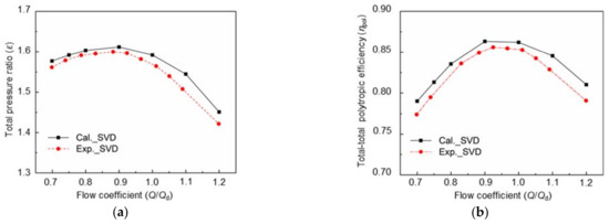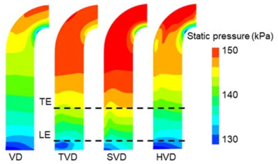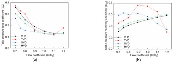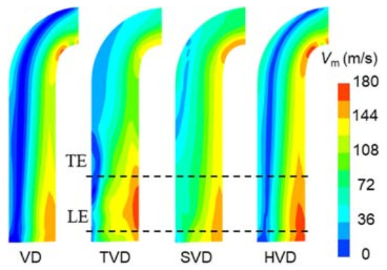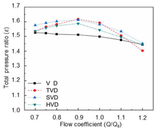 - The centrifugal compressor with TVD has the highest total pressure ratio, the minimum Cpt, and maximum Cps at the design operating point. In contrast, SVD has better flow adaptability, and HVD has the same internal flow characteristics as VD, especially at a low mass flow rate.
