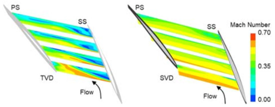 - The mechanism of the improvement in stability by the SVD is that the high-momentum fluid from the vane pressure surface to the suction surface flows to the shroud side through the vane root, which prevents the growth of the boundary layer and the generation of flow separation on the suction surface of the diffuser vane.