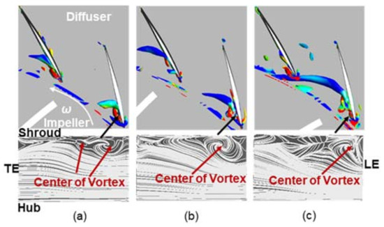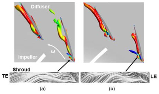 - Zhao, P.-F.; Liu, Y.; Wang, X.-F. Analysis of vortices and performance of different diffusers in a large mass flow coefficient centrifugal compressor. Proc. Inst. Mech. Eng. Part A J. Power Energy 2017, 231, 253–273. [Google Scholar] [CrossRef]