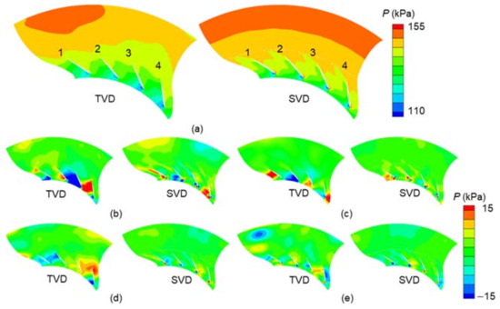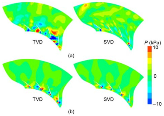 - The POD and DMD analysis show that the amplitude of pressure fluctuations at the selected cross-section of TVD is higher than that of SVD under the same operating condition. The spatial distribution of the pressure field in the diffuser passages demonstrates that the large-scale flow structure almost blocks the part of diffuser passages, which is also a primary reason for the diffuser stall. Therefore, SVD can improve the stability and performance of the compressor stage when compared to TVD.
