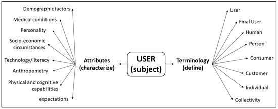 Figure 2 synthesizes the terminology referring to the user based on the definitions above. On the right-hand side, the authors list all the terms referring to “user” identified analyzing the literature, while on the left-hand side, the main attributes that characterize the subject-user are reported.