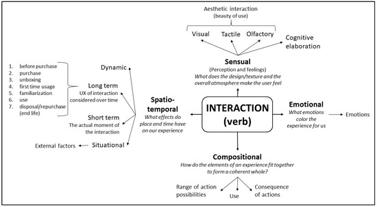 Figure 3 summarizes all the main interpretations of interaction provided by the literature. The scheme is based on the four threads individuated by McCarthy and Wright [2] and has been extended considering other scholars’ interpretations. Here, interaction and experience are strongly related since the interaction leads to the experience. It is acknowledged that a multisensorial way to perceive a product can elicit a complete experience, which would be impossible to achieve just through sight. As a result, it is possible to claim that the interaction is the core of the experience.