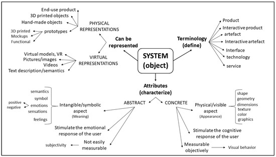 The “system” can be found in the literature with different interpretations and described with different terms. The most common ones are “product” or “interactive product” [27,36,44], but it can also be called “artifact” [1,26,58] and “interface” [59]. Since the product can also be intended as “technology” and “service”, authors adopted the term “system” used by Norman. The term “system” synthesizes both concrete and abstract aspects of a product [60]. The bullet list that follows shows these aspects in detail.