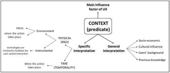 The context of use completes the user-system picture, providing the frame where the interaction takes place, just as complements enrich the meaning of the sentence in grammar. Bargas-Avila and Hornbæk, [23] claim that the context of use is a key factor in UX; overall, this idea is widely recognized by the literature [1,2,27,37,38,39,43]. The impact of the context is due to the variety of elements that are considered within this concept. “Context” can be interpreted as (Figure 5):