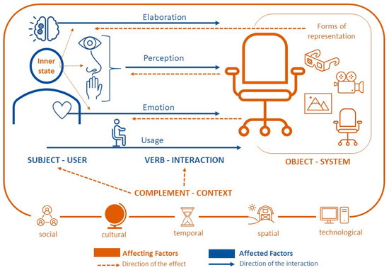 Markedly, in Figure 6, the affect-effect relationships have been represented through different colors (blue indicates the affected factors, orange is for the affecting elements). The orange dashed arrows indicate the direction of the effect, while the continuous blue ones show the direction of the interaction. For instance, the presence of the continuous blue line connecting the verb-interaction and the object-system is based on the description reported in Section 3.3 with regards to the impact of the appearance of the system on the user interaction [61]. In particular, the dotted orange line under the “perception” continuous blue line highlights the ability of the system to trigger the user’s senses through its aesthetics [33]. Likewise, the presence of the continuous blue line connecting the “emotion” verb-interaction and the object-system is based on the description reported in Section 3.3 about how the abstract aspects of the system can be an affecting factor for the user’s emotion [33]. The framework shows that the inner state of the user affects all the different typologies of the verb-interaction (elaboration, perception, emotion, and usage) [56], which are also affected by the appearance [61] and abstract aspects [33] of the product, and the forms through which it is presented to the user (image, video, final product, 3D model, and VR, among the others) [43,63]. Moreover, social, cultural, temporal, spatial and technological factors of the complement-context affect the overall subject-user and the verb-interaction, which results the most affected key component in UX.