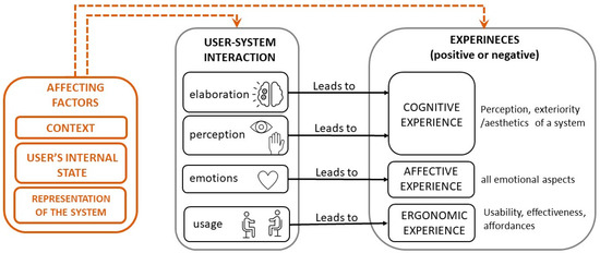 Representation of user-system interactions, the derived different experiences (cognitive, affective, and ergonomic) and the influence factors that affect the overall UX.