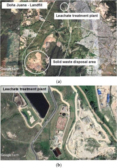 Location of the study area: (a) MSW disposal area and (b) leachate treatment plant (Google Earth Pro, 2021).
