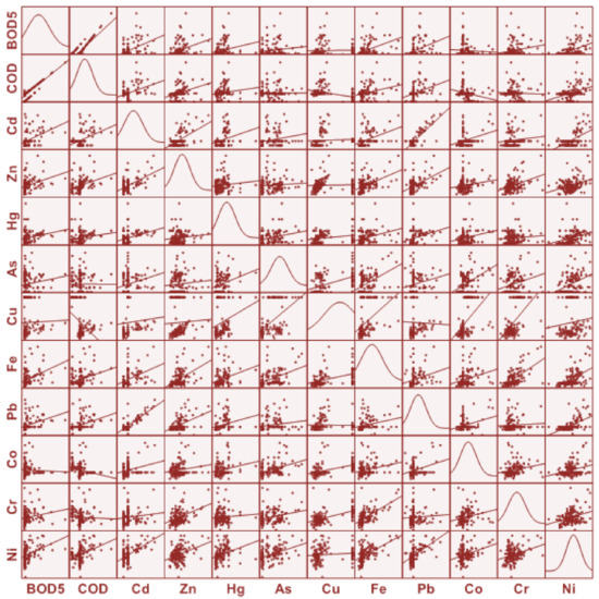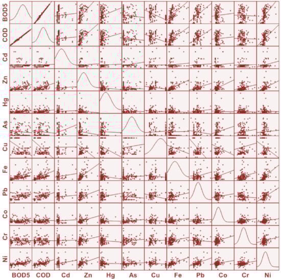 The laboratory analyses were developed in accordance with the guidelines of the Standard Methods for the Examination of Water, and Wastewater [31]. The methods used for each parameter were as follows: BOD5, SM 5210 B, 4500 O, and C, Incubation Azide Modification; COD and SM 5220 C, Volumetric, Closed Reflux; NH4, SM 4500-NH3 B, and C, Titrimetric Method; and Cd, Zn, Hg, As, Cu, Fe, Pb, Co, Cr, and Ni, SM 3125 B, Inductively Coupled Plasma-Mass Spectrometry (ICP-MS) Method.