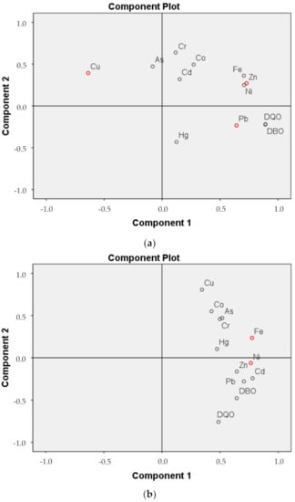 Additionally, BOD5 and COD concentrations had no significant correlations with the Cu and Pb concentrations (Figure 2). However, an analysis of principal components between the BOD5 and COD concentrations, and the concentrations of all HMs allowed visualizing a first component of four consisting of the following parameters and metallic elements (determinant < 0.001): COD, BOD5, Zn, Ni, Fe, Pb, and Cu (variance = 33.9%). Thus, it was observed that Zn was the metallic element of best correlation with the DBO5 and DQO concentrations in untreated leachate (BOD5-r = 0.516, p-value < 0.001; COD-r = 0.519, p-value < 0.001). The above also supported the selection of Cu, Pb, and Zn as possible HM indicators of the behaviour of the leachate untreated in this study. Figure 3a shows the HM indicators of untreated leachate on a diagram of two principal components, for better visualization. It was also observed that in each quadrant of the diagram an indicator HM was placed. Wdowczyk and Szymańska-Pulikowska [50] also used these three HMs as indicators of the pollution degree of untreated leachate in active and closed landfills in Poland.