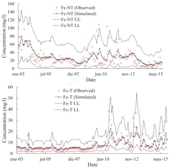 Observed and simulated (ARIMA) values for Fe and Ni concentrations in untreated and treated leachate during the study period. NT = Untreated, T = Treated, UL = Upper limit, and LL = Lower limit.