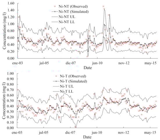 Additionally, it was observed that the AR terms of ARIMA models developed for concentrations of Fe, Cr, and Ni in treated and untreated leachate were similar (AR = 1). The Cd also showed a similar trend. In this way, the results suggested that the treatment plant did not have the ability to change the ARIMA temporal structure of these HMs (decrease in the term AR), possibly due to its high inlet concentrations (Figure 5). This also suggested a decrease in the removal efficiency of these HMs by the leachate treatment plant under study. The removal efficiencies of Fe, Cr, Ni, and Cd observed at the leachate treatment plant during the study period were 52.4%, 33.5%, 12.8%, and 17.0%, respectively (Table 1). Overall, the removal rates of all HMs in the leachate treatment plant were low (average = 26.1%). Figure S1 shows a scatter plot for the observed and simulated (ARIMA) values of Fe and Ni concentrations in untreated and treated leachate during the study period.